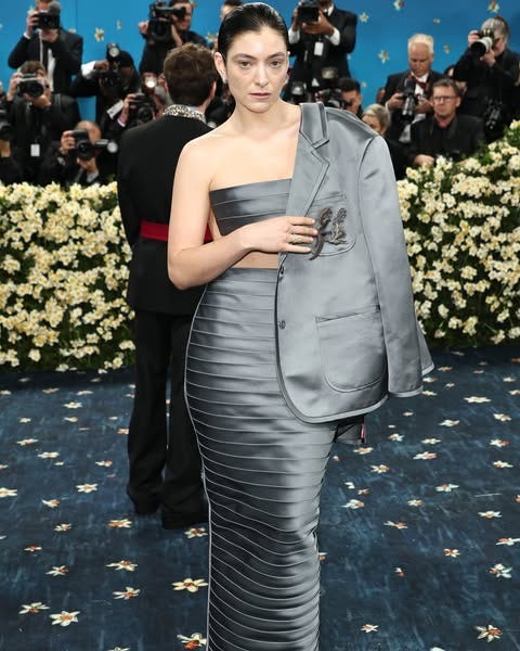 Lorde wears Thom Browne and Cartier. For Lorde, her look by Thom Browne brought new life and meaning to her red carpet style. “To me it represents where I’m at gender-wise. I feel like a man and a woman, you know?” Lorde tells Emma Chamberlain in her interview on the red carpet. This understated interpretation of the theme combined feminine and masculine elements; from the floating top and corset-tied skirt to the silk blazer and striking backless silhouette. “All will be revealed,” the singer teased.