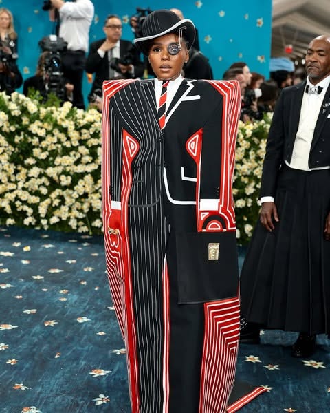 Janelle Monáe in custom Thom Browne. On the red carpet, Monáe gave a masterclass in Black dandyism. Her look, featuring sharp pointy shoulders and a print that could give anyone vertigo was a nod to 1930s tailoring and surrealism, in collaboration with Oscar winner Paul Tazewell and designer Thom Browne. Tazewell is first Black man to win best costume design at the Oscars for his work in Wicked.