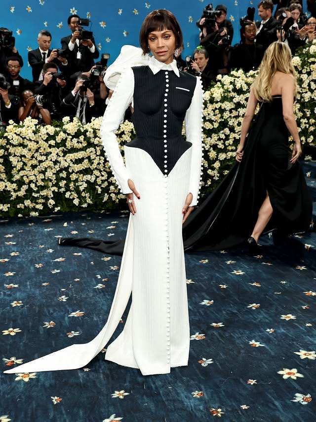 Zoe Saldaña in Thom Browne and Cartier. Thom Browne knows how to steal a show. His signature sculptural silhouette helped reinterpret the theme of tailoring through corsetry details — offering a distinct nod to the feminine.