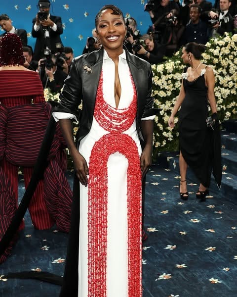 Ayo Edebiri, in custom Ferragamo. As an homage to the dandies in her family, particularly her father, Edebiri collaborated with Ferragamo’s own Maximilian Davis on her ensemble. The wool-silk, floor-length shirt dress, glass beads and leather tailcoat crafted a look that both celebrates the theme and her culture. The red beading was a nod to her father, referencing the coral often found on traditional Nigerian outfits. “There is a focus on impeccable tailoring, luxurious fabrics, and subtle details that speak to the brand's heritage — but with a modern twist that reflects the spirit of Black dandyism and Ayo’s families deep roots to Nigeria and the Caribbean," Davis told Vogue.